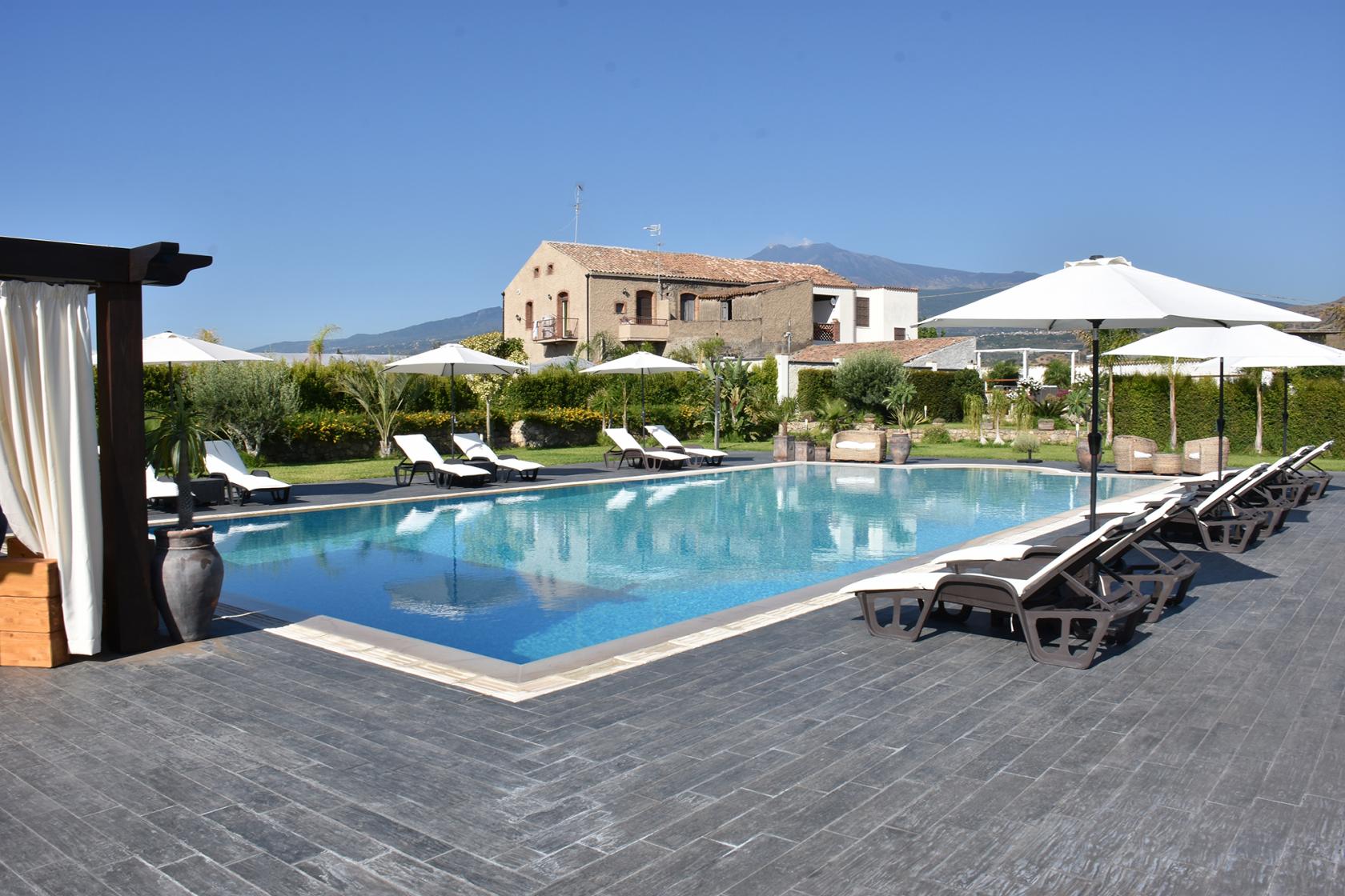 This luxury property is a modern Sicilian country villa in Giardini Naxos, not far from the town center of Taormina. The beautiful bay of Mazzarò and several beaches are within 5 km. distance, while San Marco beach can be reached on foot from Villa Fenice. The Alcantara Gorges and Mount Etna can be reached in 30 minutes. The modern comforts, combined with superb views and exceptional rates, make this holiday villa of the best properties in Sicily. This Luxury Villa near Taormina is divided into the ground and first floor. On the ground floor, there is a modern kitchen, a reading area, a dining room, a living room to watch TV, enjoy some play stations and listen to music, we also have a double bedroom and bathroom with shower. The first floor of this elegant Sicilian Villa is divided into four double bedrooms, a terrace, and a balcony. Villa Fenice can accommodate up to 18 guests. All bedrooms are air-conditioned and Wi-fi.The outdoor area of Villa Fenice features a barbecue, an elegant dining area near a private swimming pool, a children's playground, and a laundry room. There is a heated whirlpool, sofas, and umbrella. The elegant swimming pool (9m x 18m), with three levels of depth, is suitable for children. Near the pool, there are showers and two toilets. Taormina Villas can organize cooking classes, babysitting, guided tours of Mount Etna, boat trips to the Isola Bella marine park in Taormina, transfer from Catania airport, and car rental.