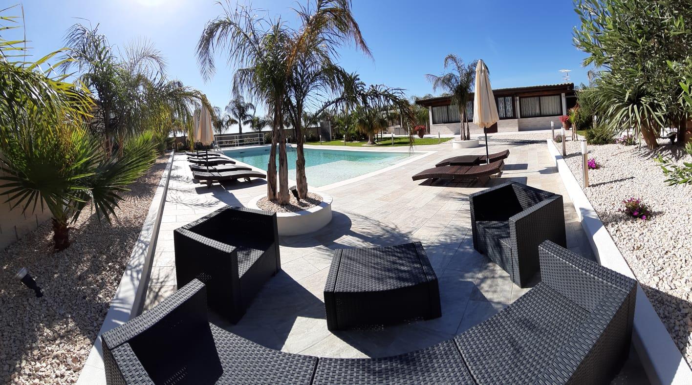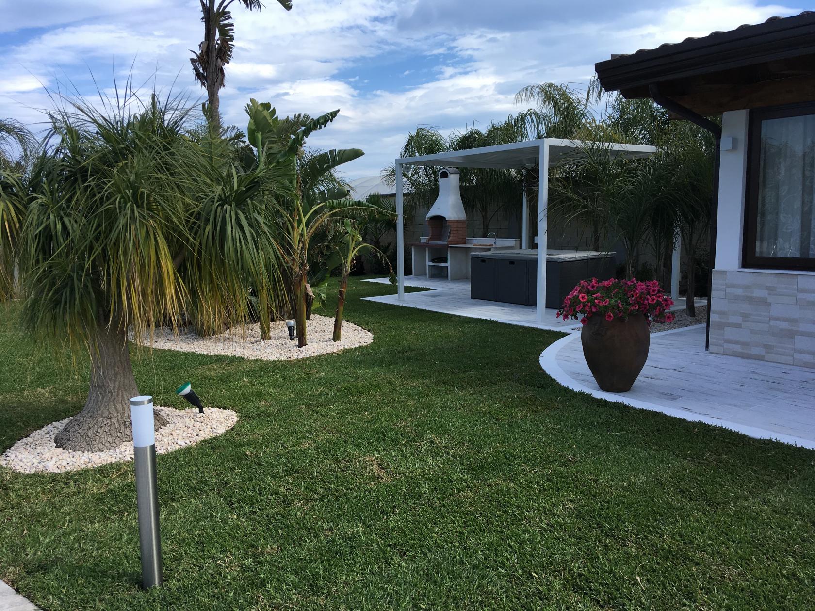La parte esterna dispone di una lavanderia completa di lavatrice e asciugatrice, di una zona relax con ampio divano, un gazebo per pranzi o cena all'aria aperta abbinato ad una zona BBQ completa di lavabo. Segue la zona piscina completa di lettini e ombrelloni e docce esterne. Infine un ampia zona parcheggio. La villa è totalmente immersa nel verde .